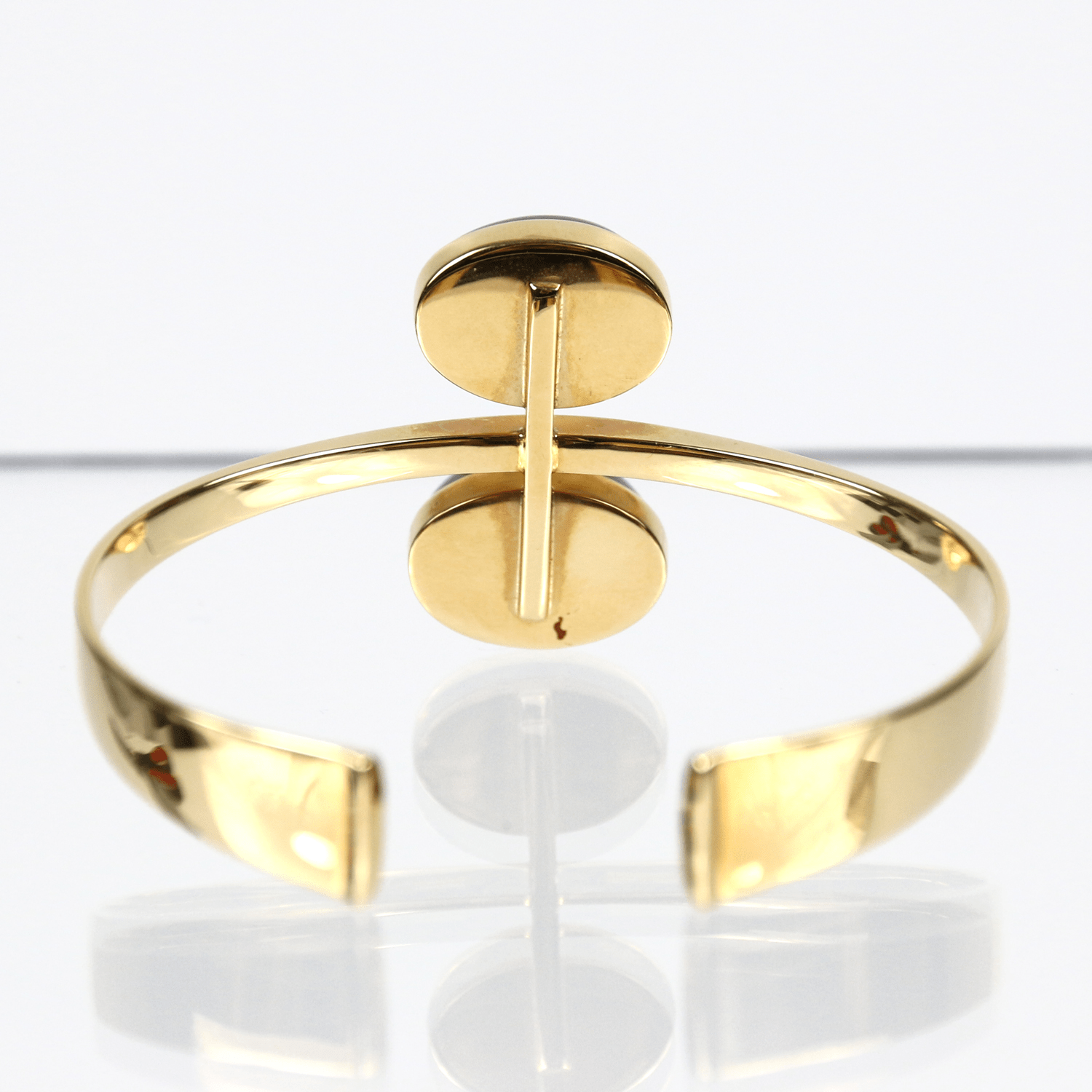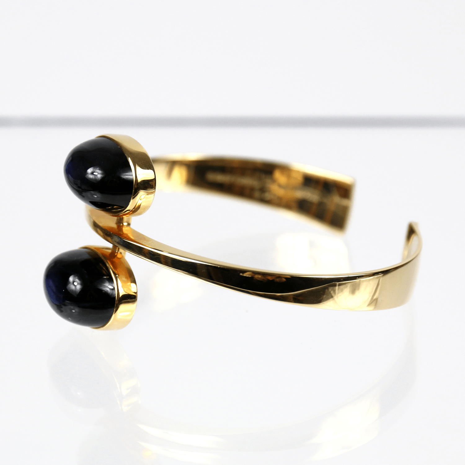 Start » Shop » Schmuck » 585/Gelbgold Armreif mit zwei dunkelblauen Mondstein-Cabochons, punziert Bent Gabrielsen Denmark, Umfang ca. 18cm