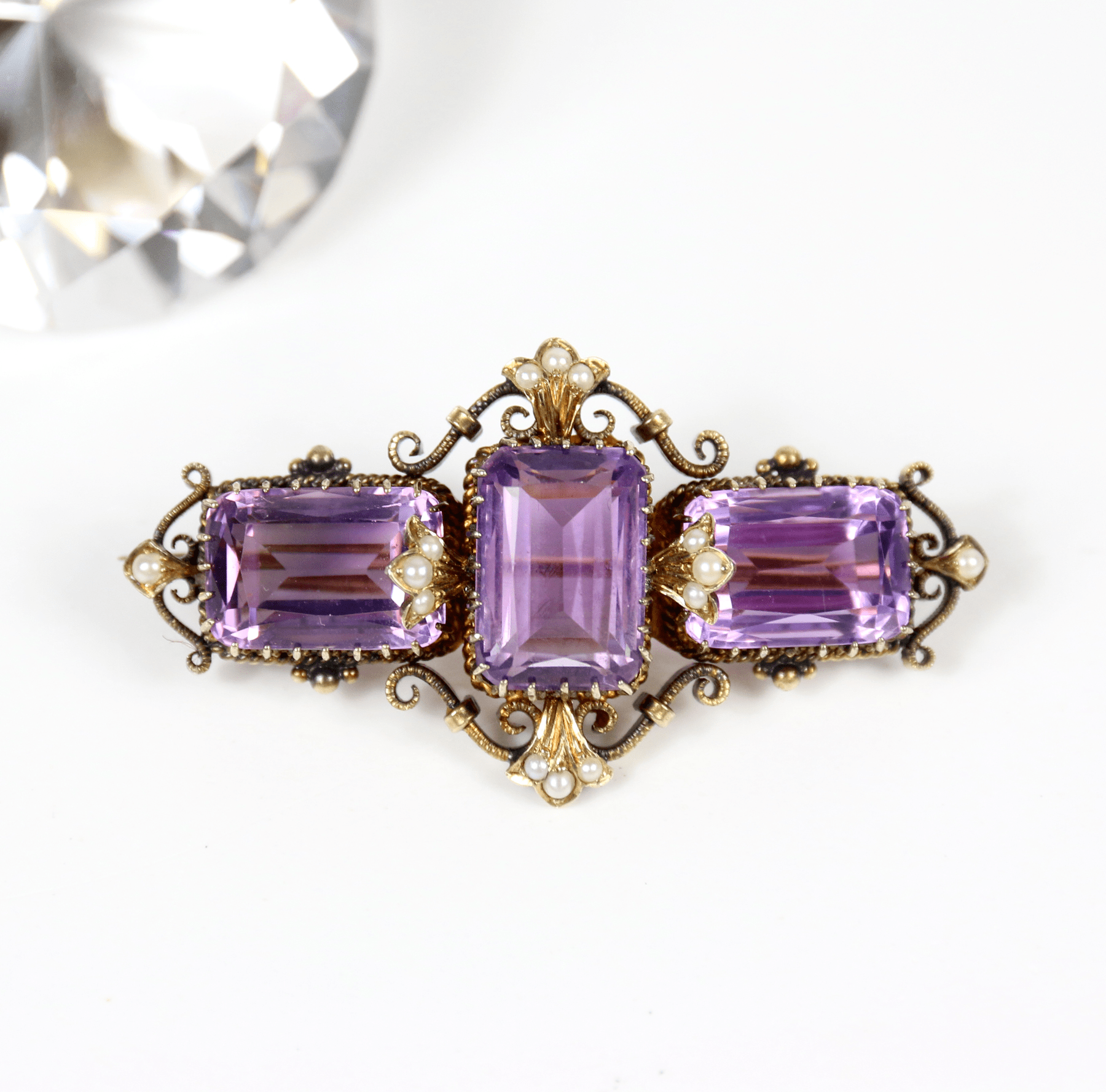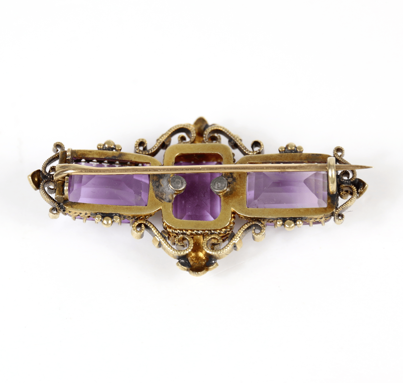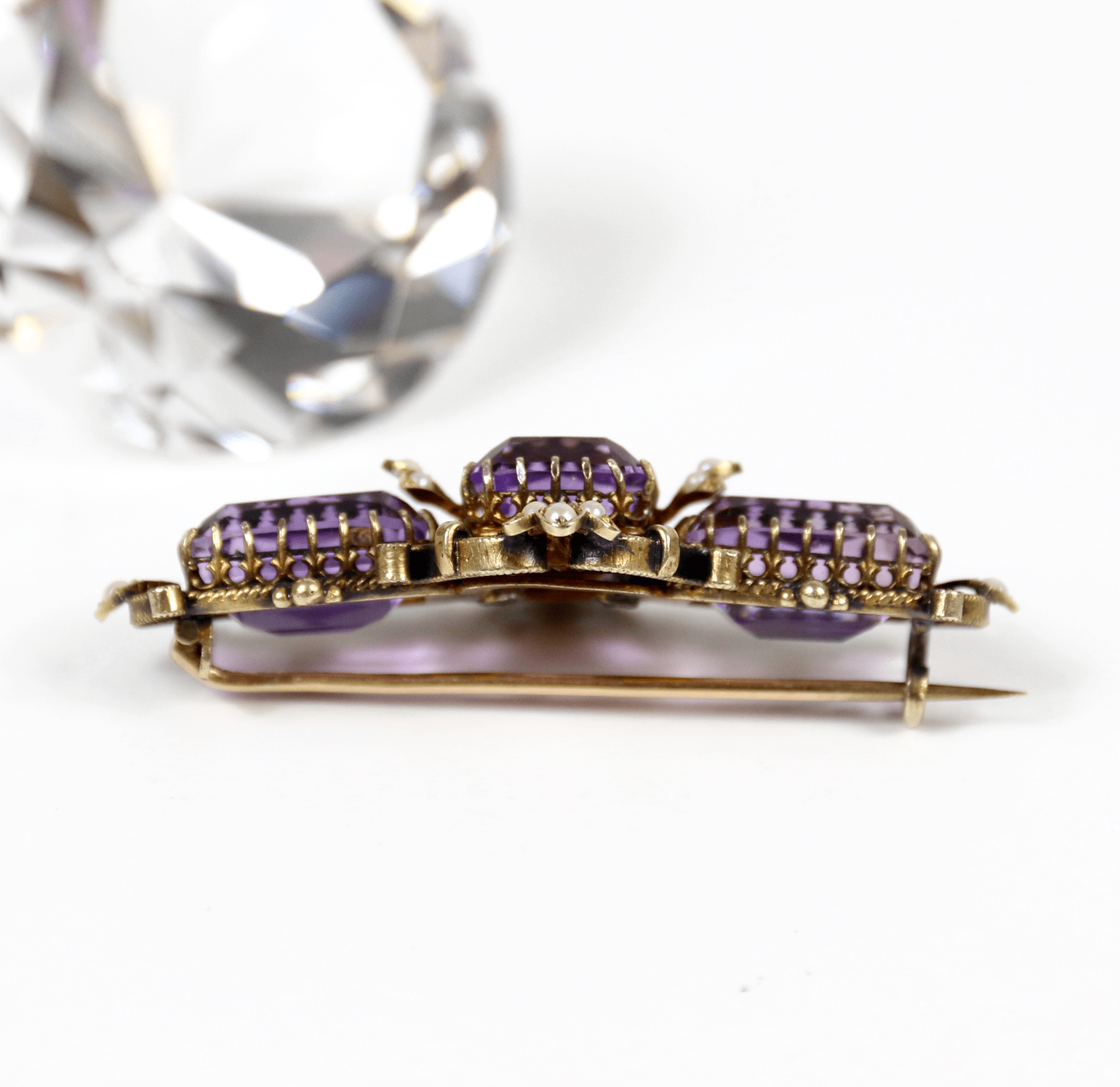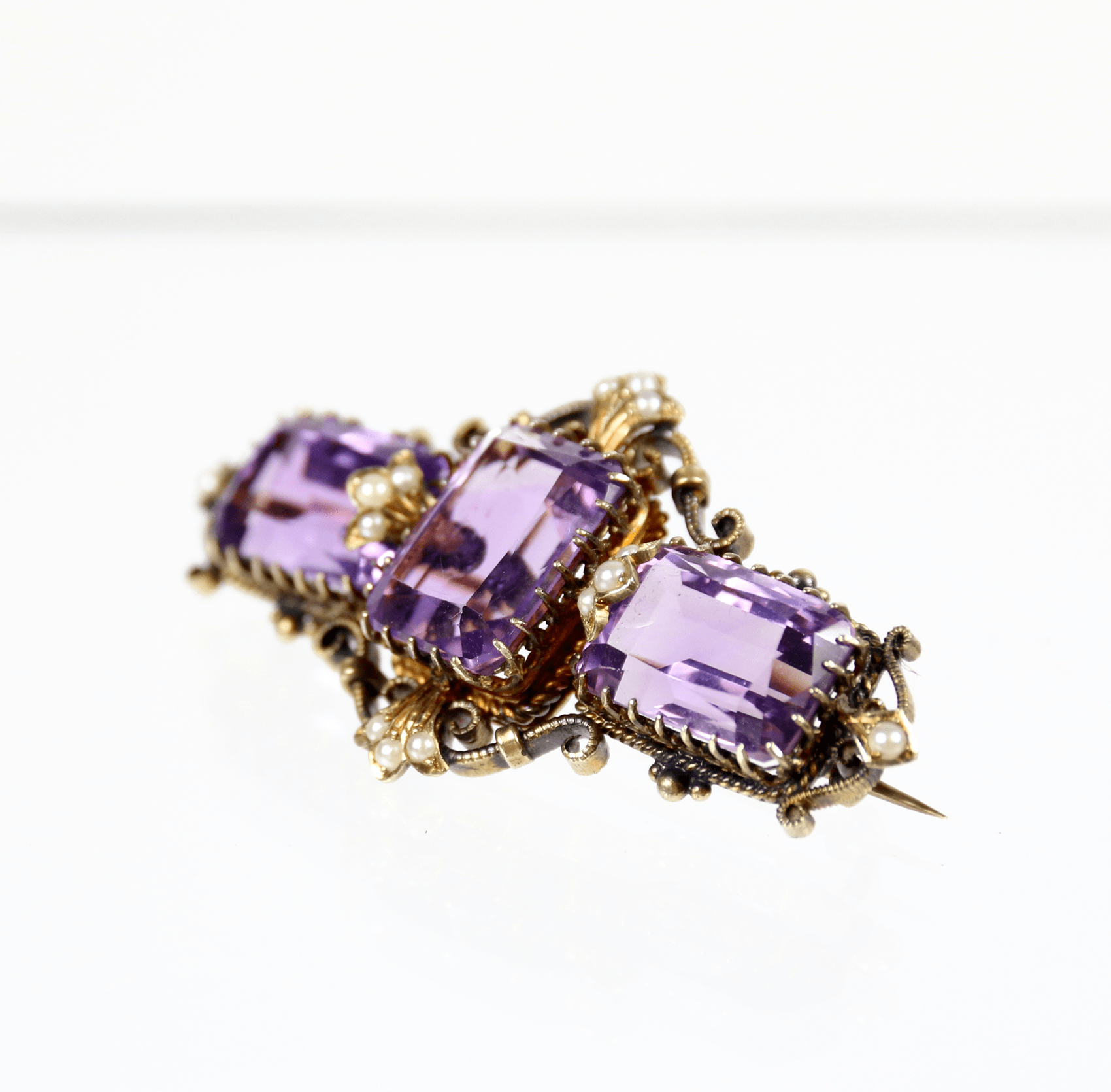Start » Shop » Schmuck » Broschen » 750/Antike Brosche mit Amethysten und Saatperlen