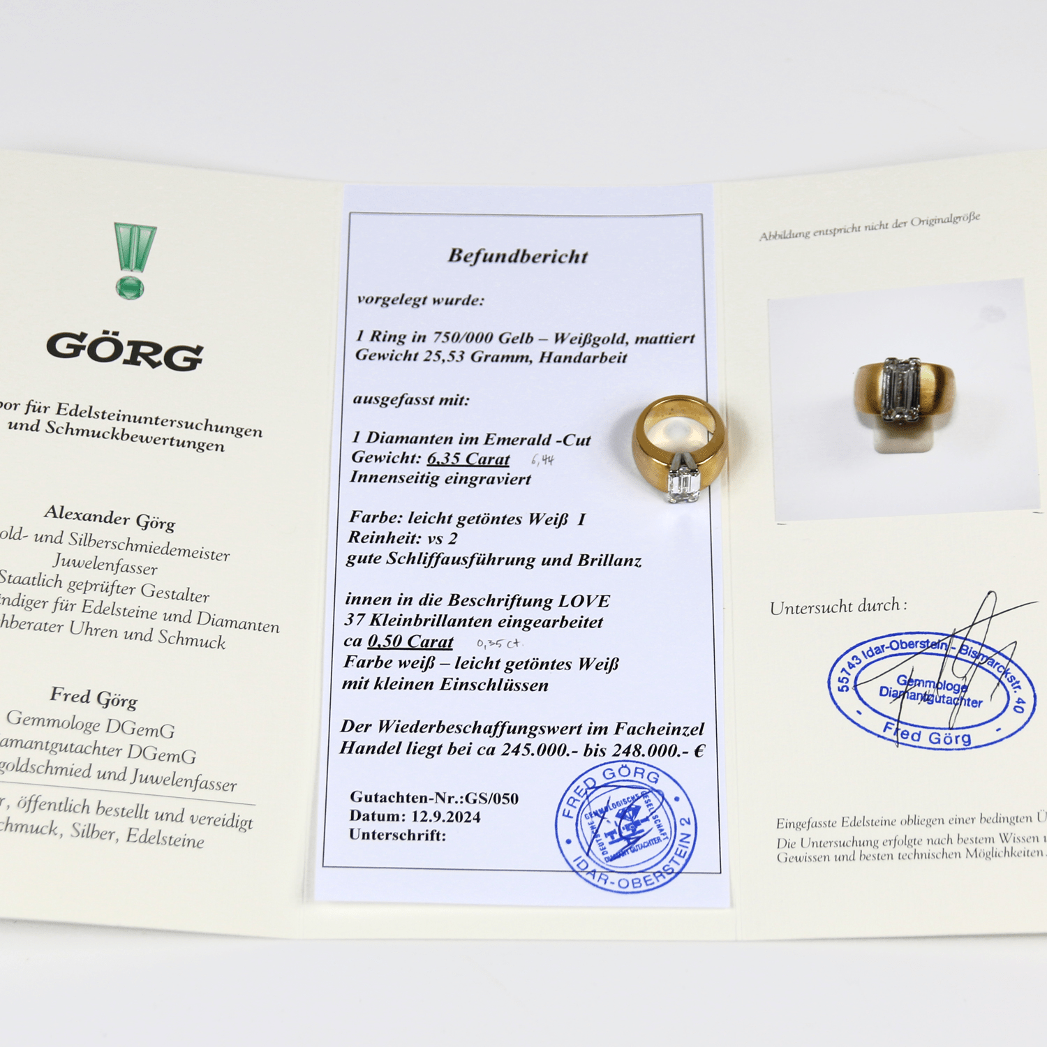 Farbe Diamant: leicht getöntes Weiß I, Reinheit VS2, gute Schliffausführung und Brillanz, innen die Beschriftung LOVE in 37 Kleinbrillanten eingearbeitet, ca. 0,5ct. Farbe weiß – leicht getöntes Weiß mit kleinen Einschlüssen.