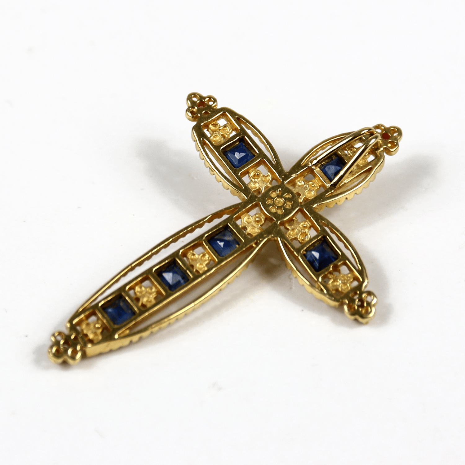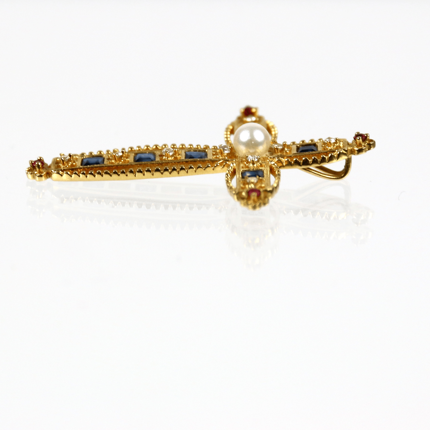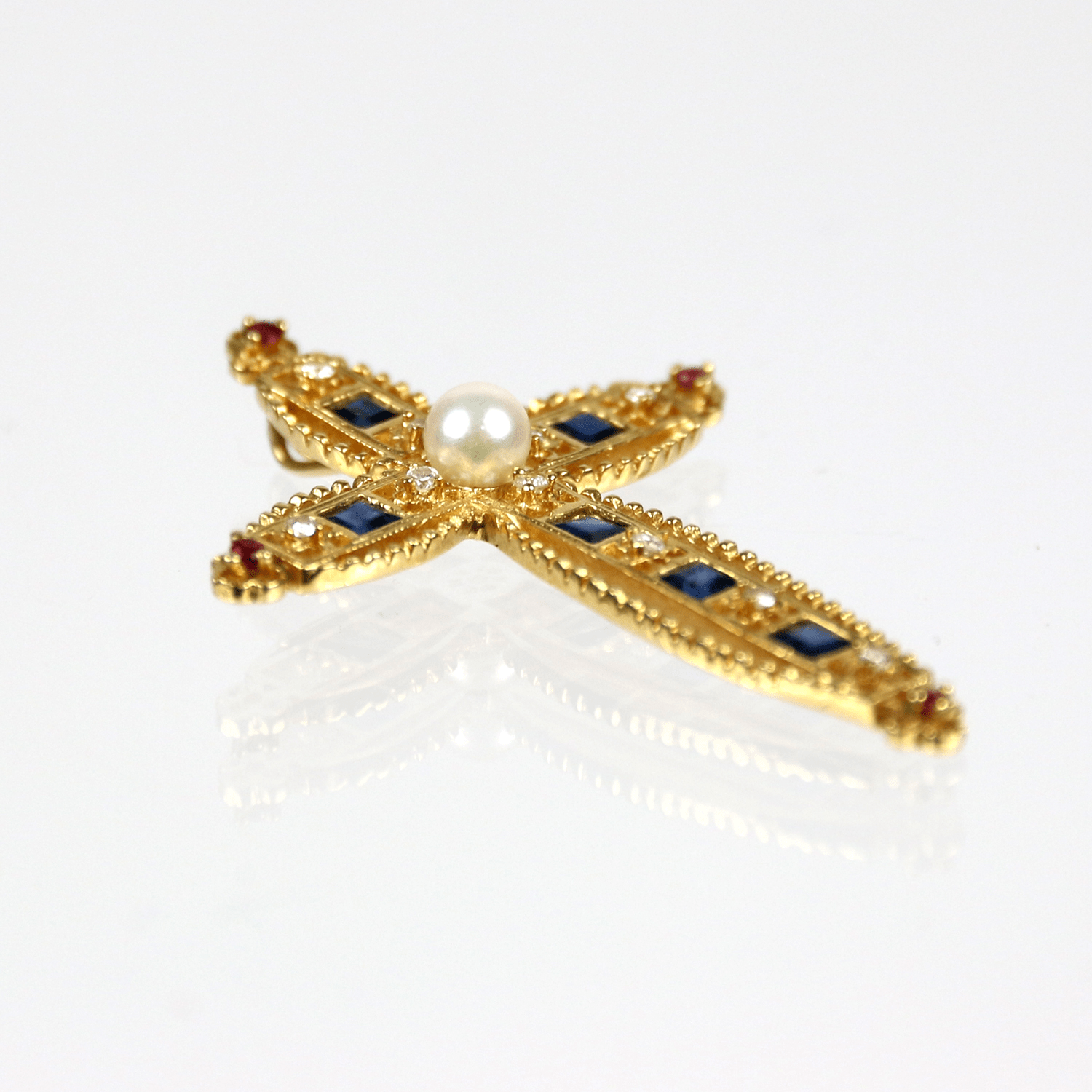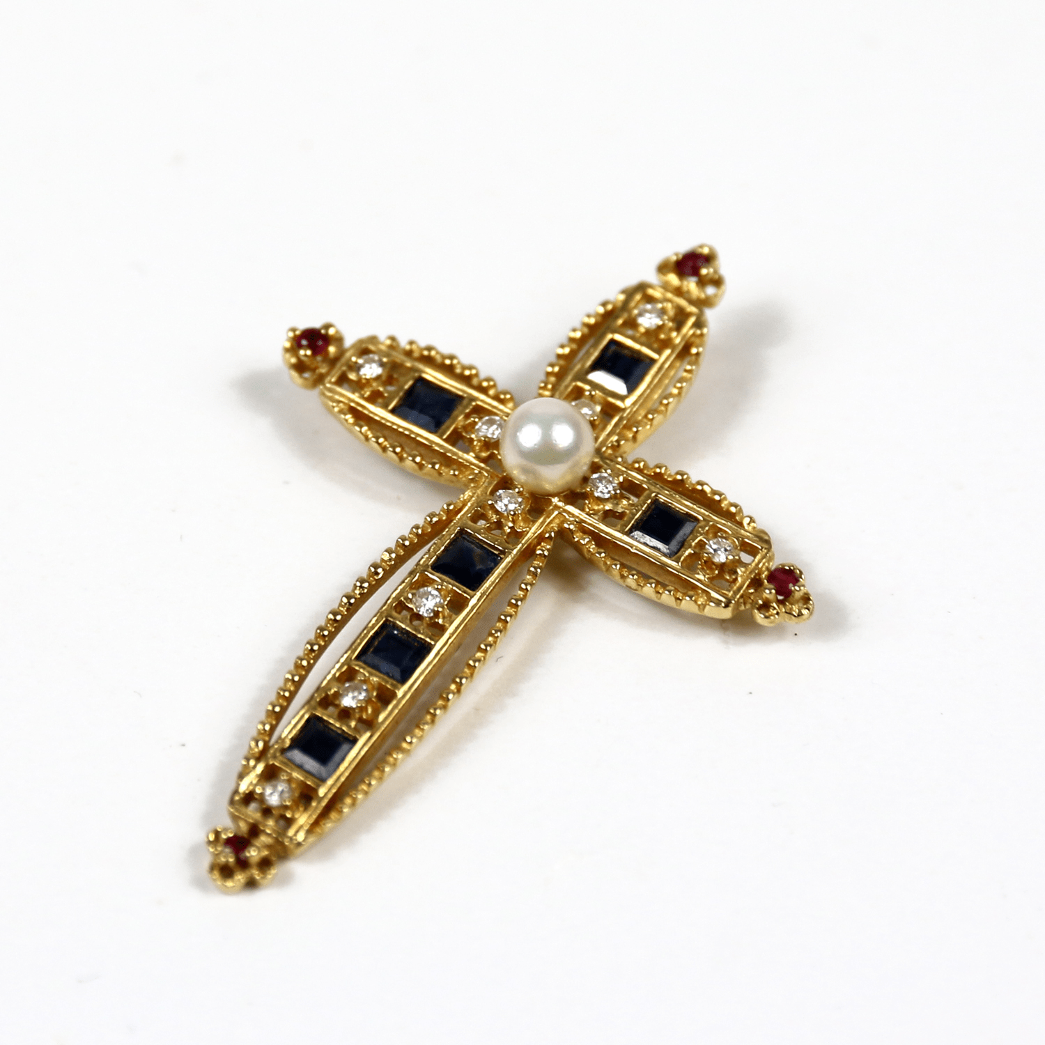 Start » Shop » Schmuck » 750/Gelbgold Kreuz-Anhänger mit Perle, kleinen Saphiren, Rubinen und Diamanten, Maße ca. 4x3cm