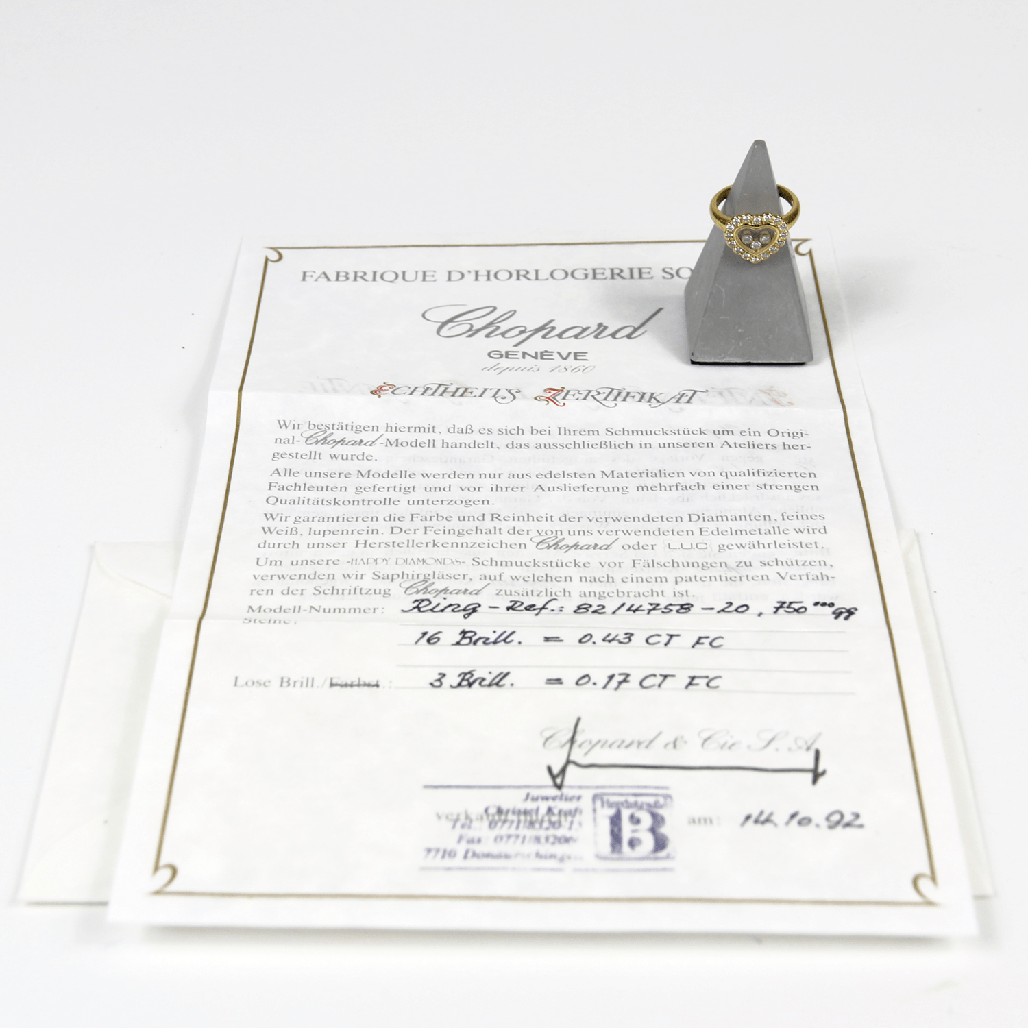 Start » Shop » Schmuck » Ringe » CHOPARD 750/Gelbgold Ring Happy Diamonds, mit Zertifikat, Ref. 82/4758-20, 16 Brillanten zus. ca. 0,43ct. und 3 bewegliche Brillanten, zus. ca. 0,17ct., Kaufdatum 10/1992