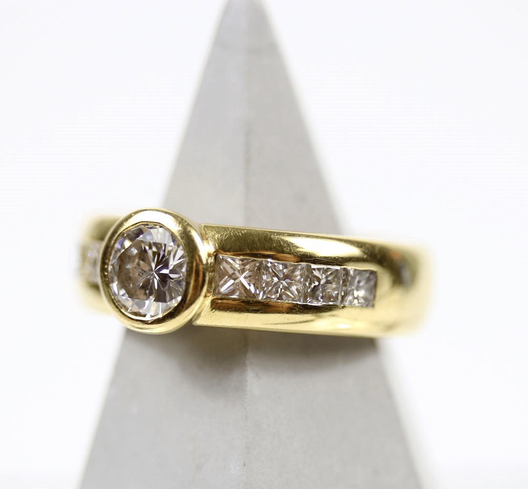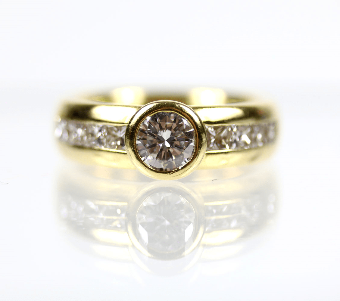 Start » Shop » Schmuck » Ringe » 750/Ring mit Brillant Mittelstein ca. 0,62ct. Vs2/L und acht Diamanten im Prinzess-Cut zus. ca. 0,8ct. Vs2/I