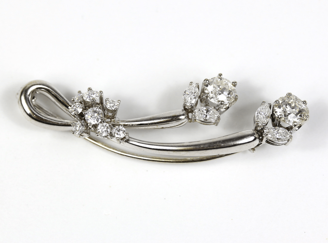 750/Weißgold Brosche mit zwei Altschliff-Diamanten zus. ca. 1,7ct. Si2-P1/I, vier Navette-Diamanten und acht Brillanten zus. ca. 0,5ct. Vs/H