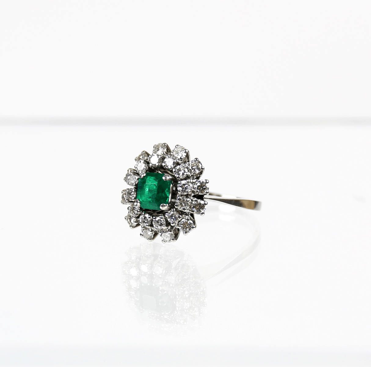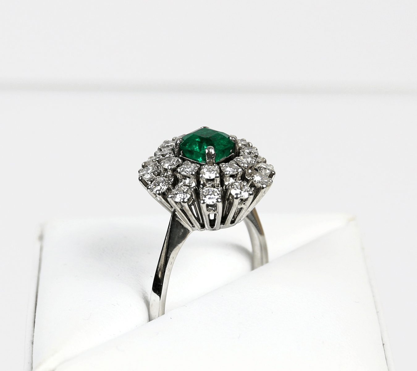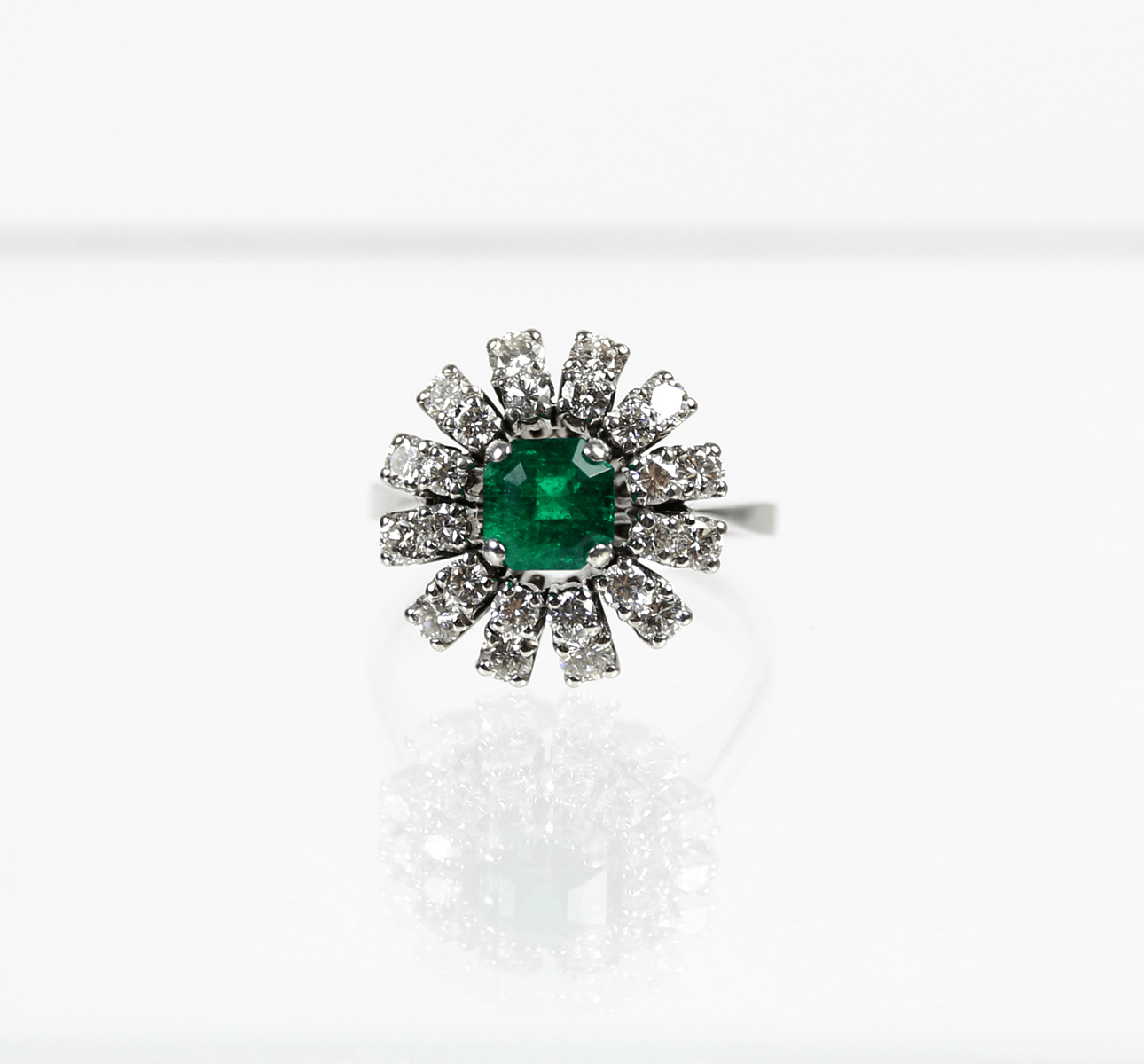 750/Weißgold Ring mit Smaragd-Carrée ca. 1,5ct. und 24 Brillanten zus. ca. 2ct. Vs-Si/H