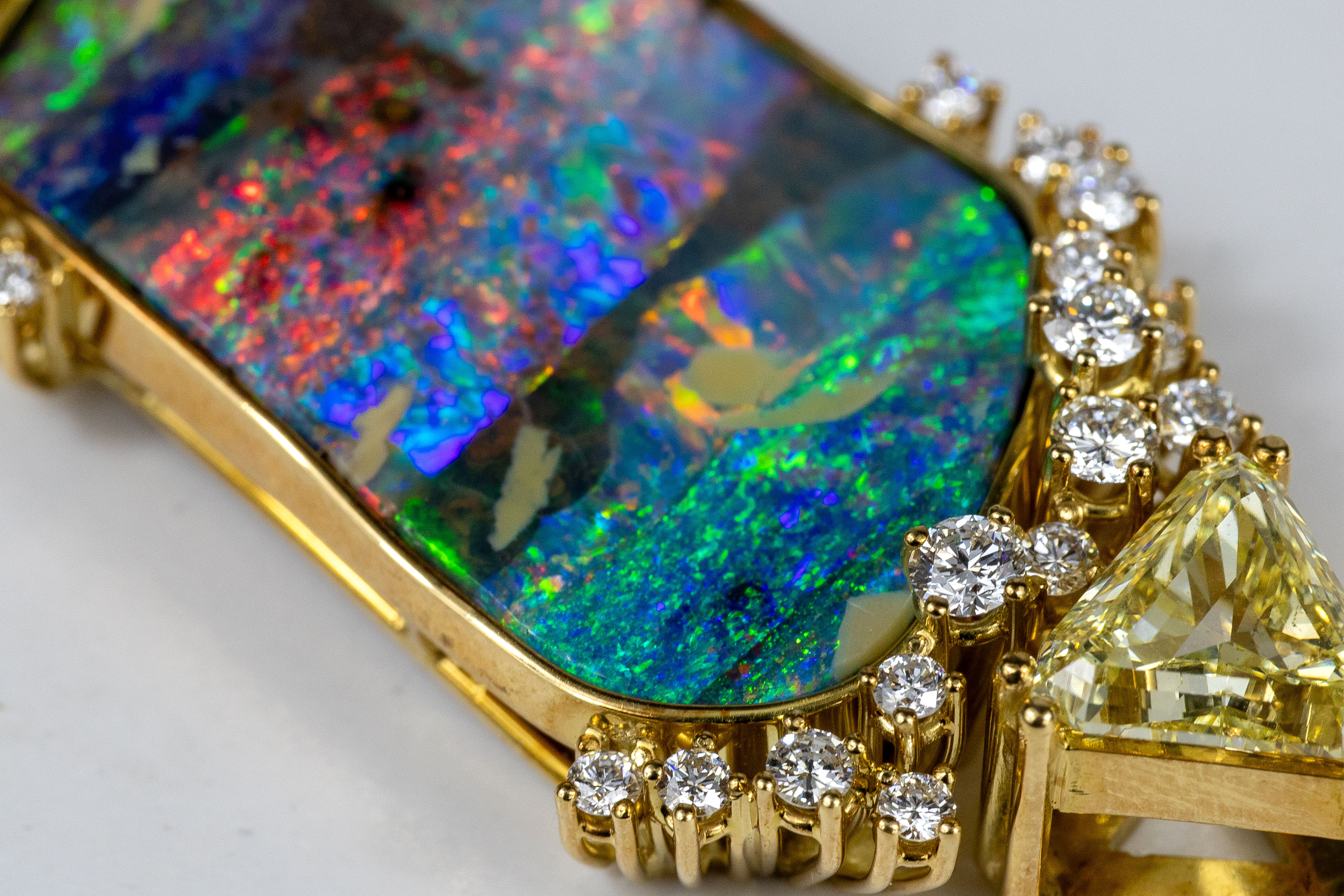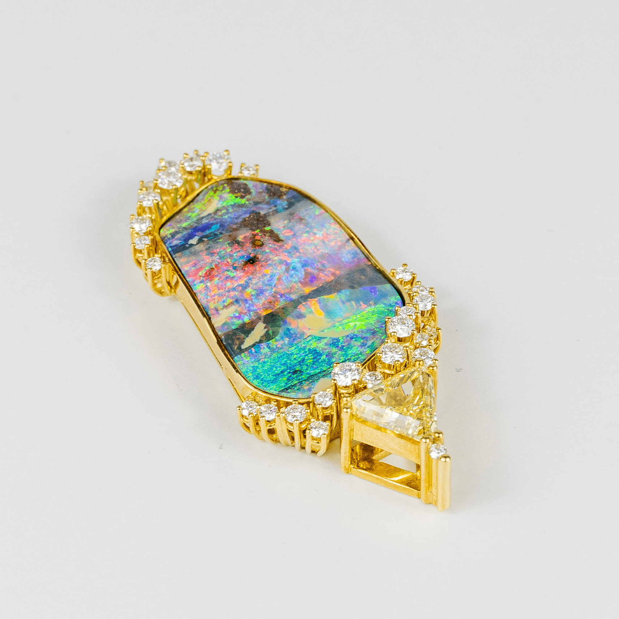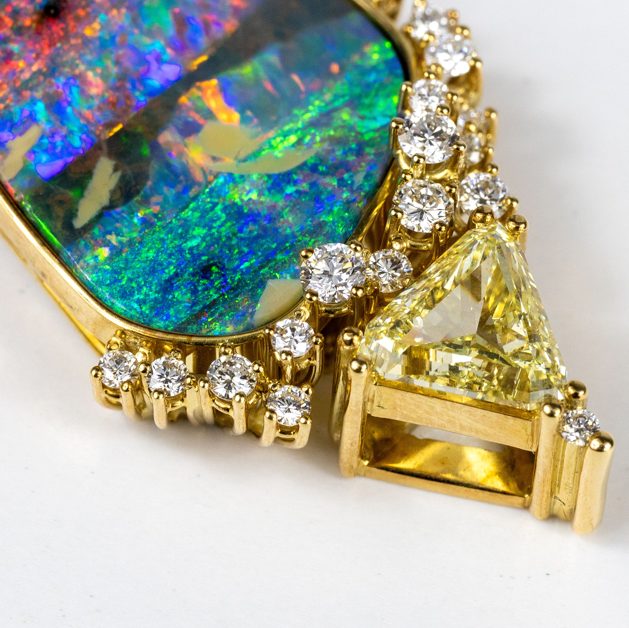 Anhänger mit Boulder-Opal gefasst in 750/Gelbgold, Diamant (Triangel) ca. 2,2ct. Vs2/Fancy Yellow und Brillanten zus. ca. 1,6ct. Vs-Si/G-J