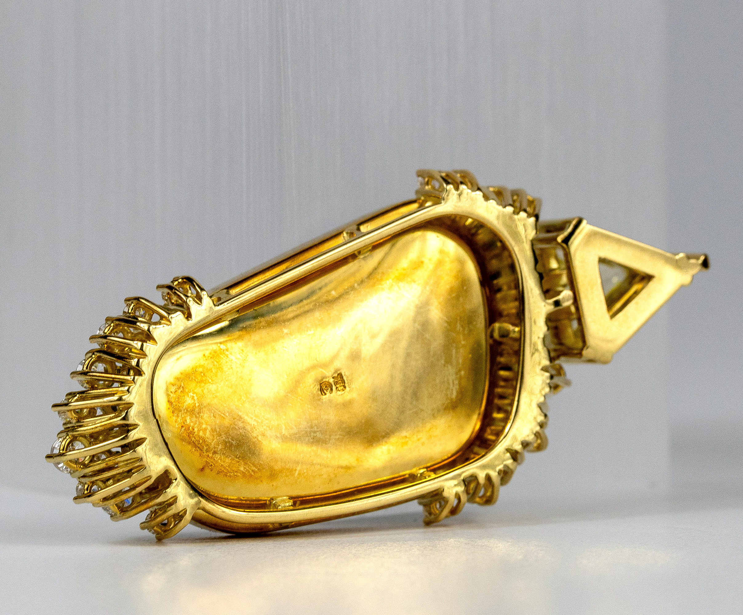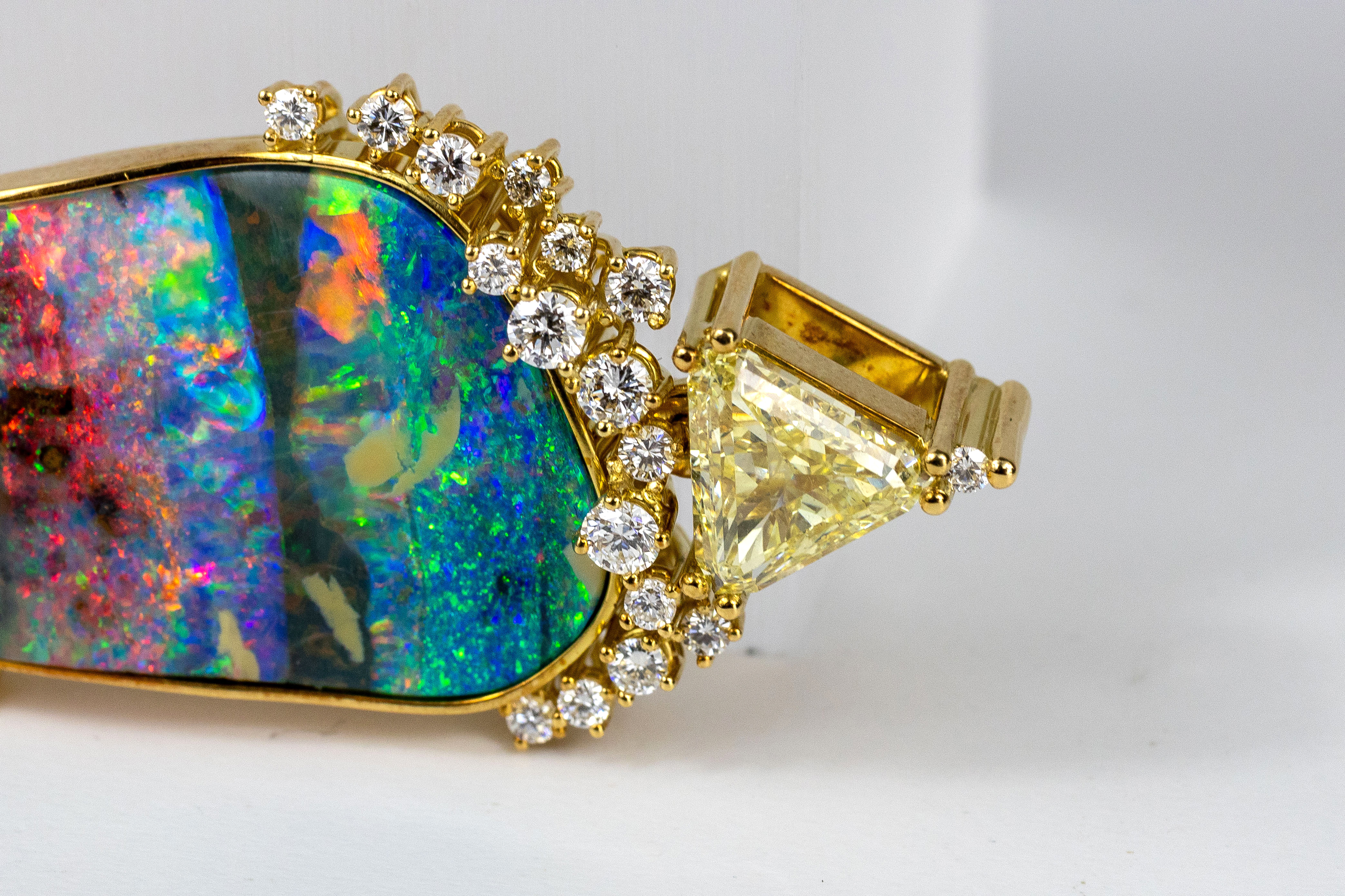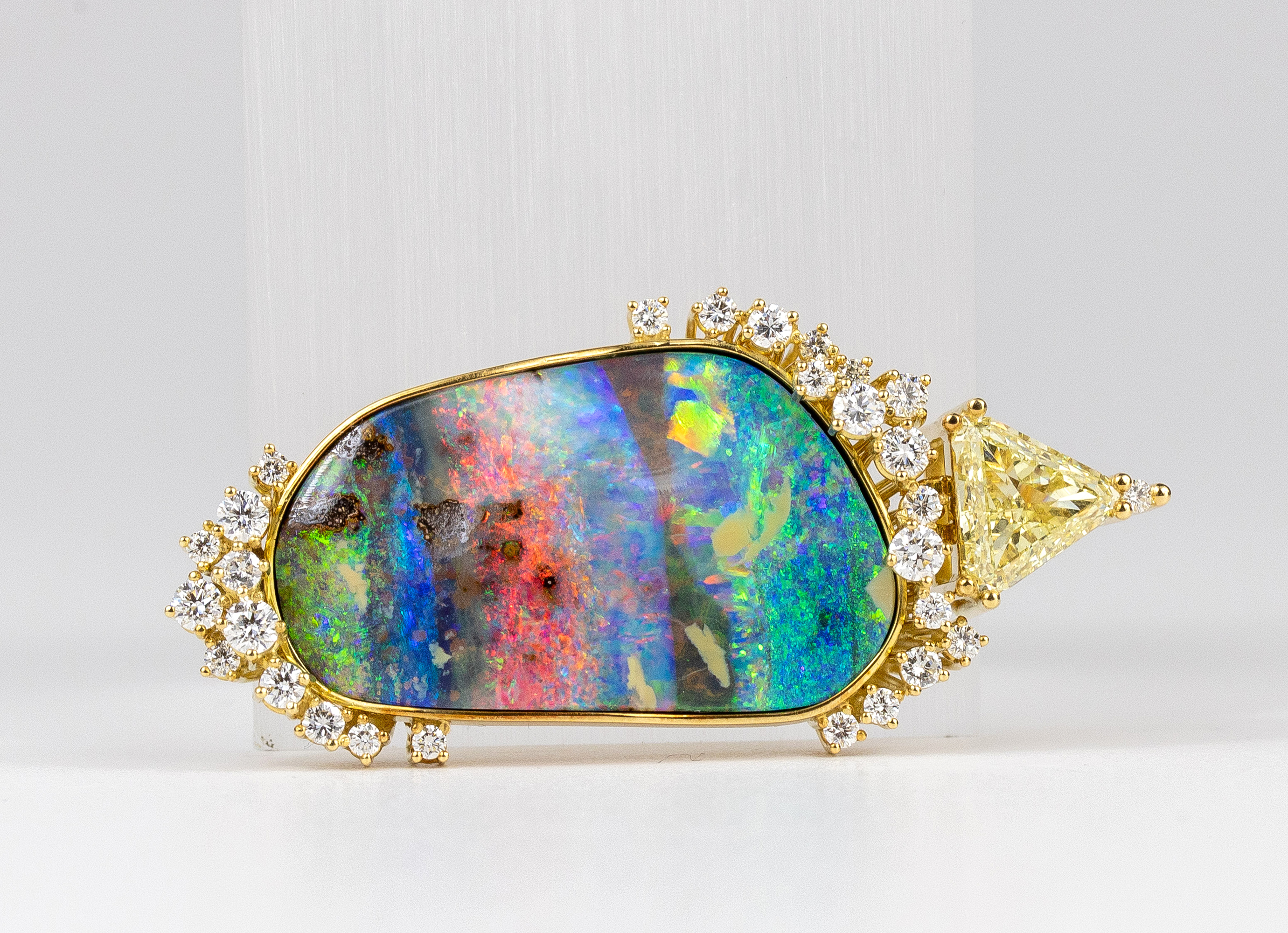 Anhänger mit Boulder-Opal gefasst in 750/Gelbgold, Diamant (Triangel) ca. 2,2ct. Vs2/Fancy Yellow und Brillanten zus. ca. 1,6ct. Vs-Si/G-J