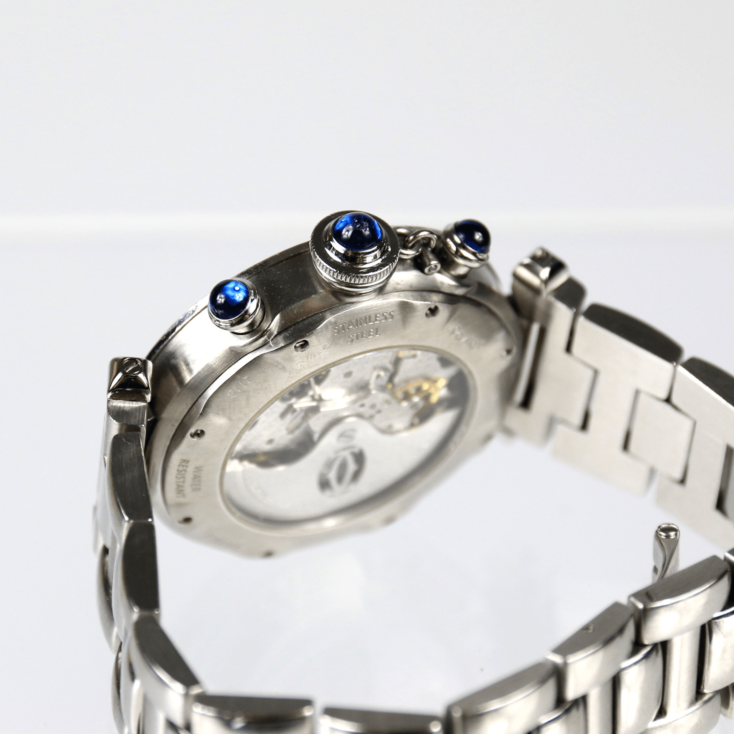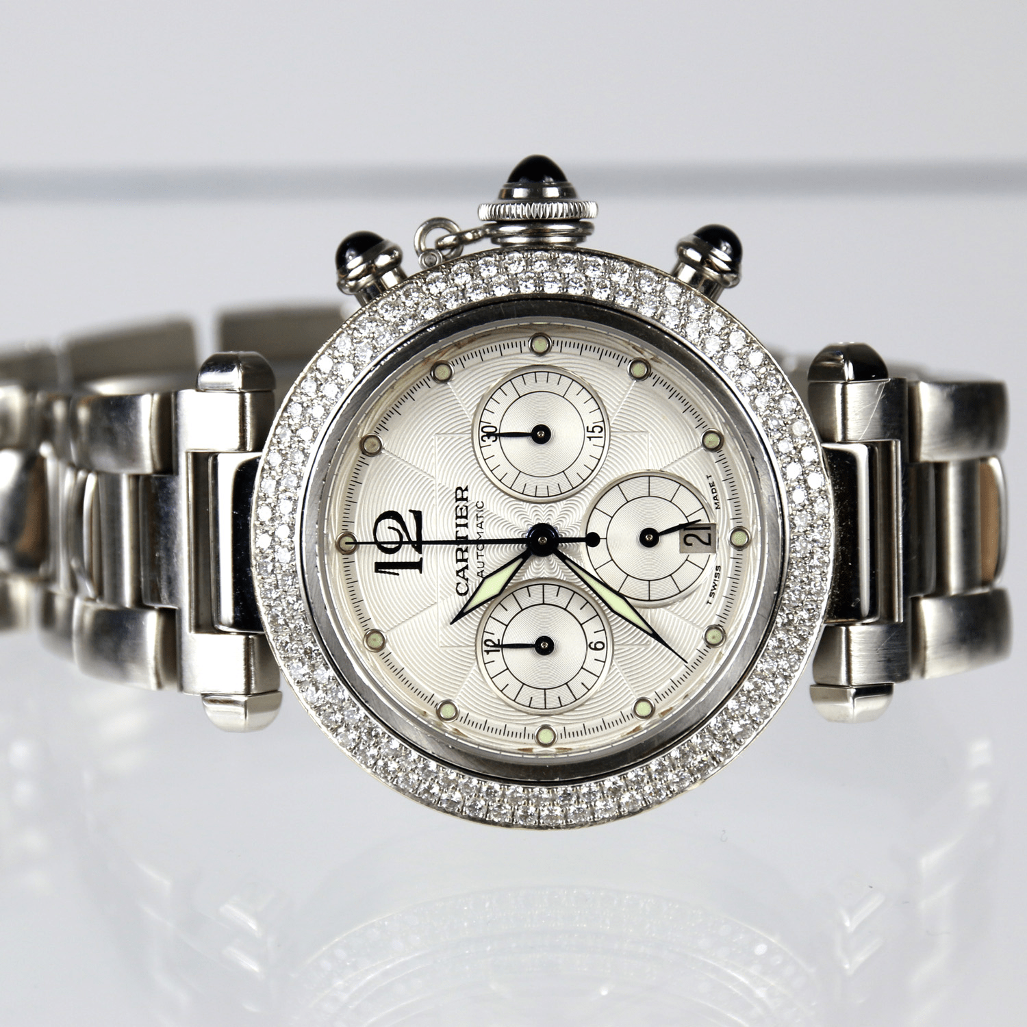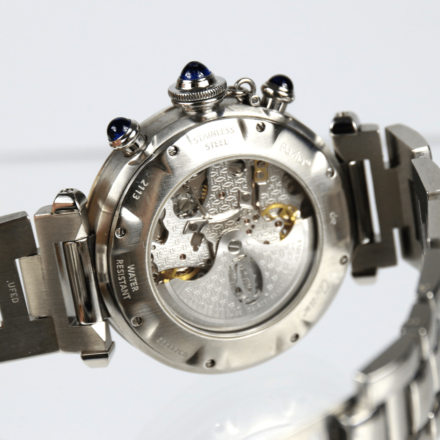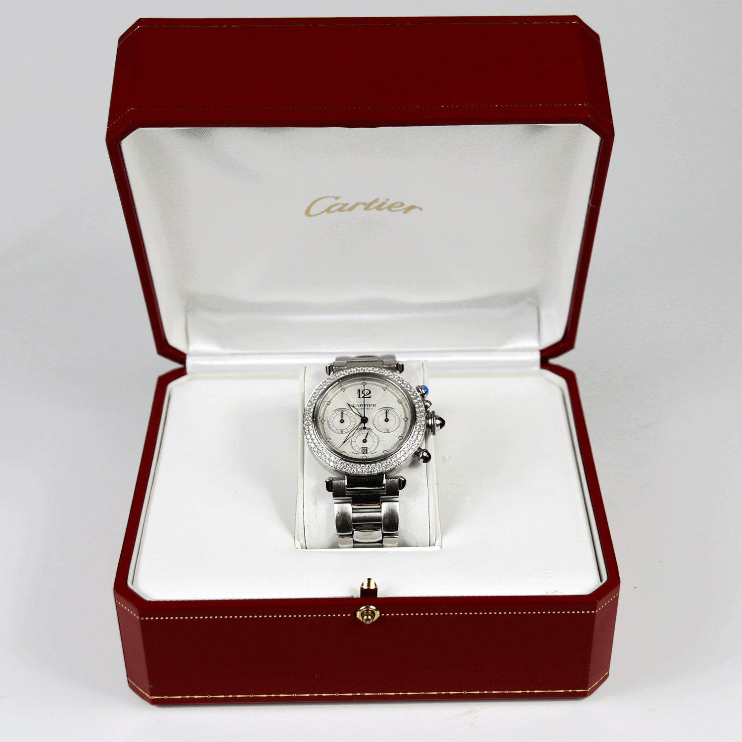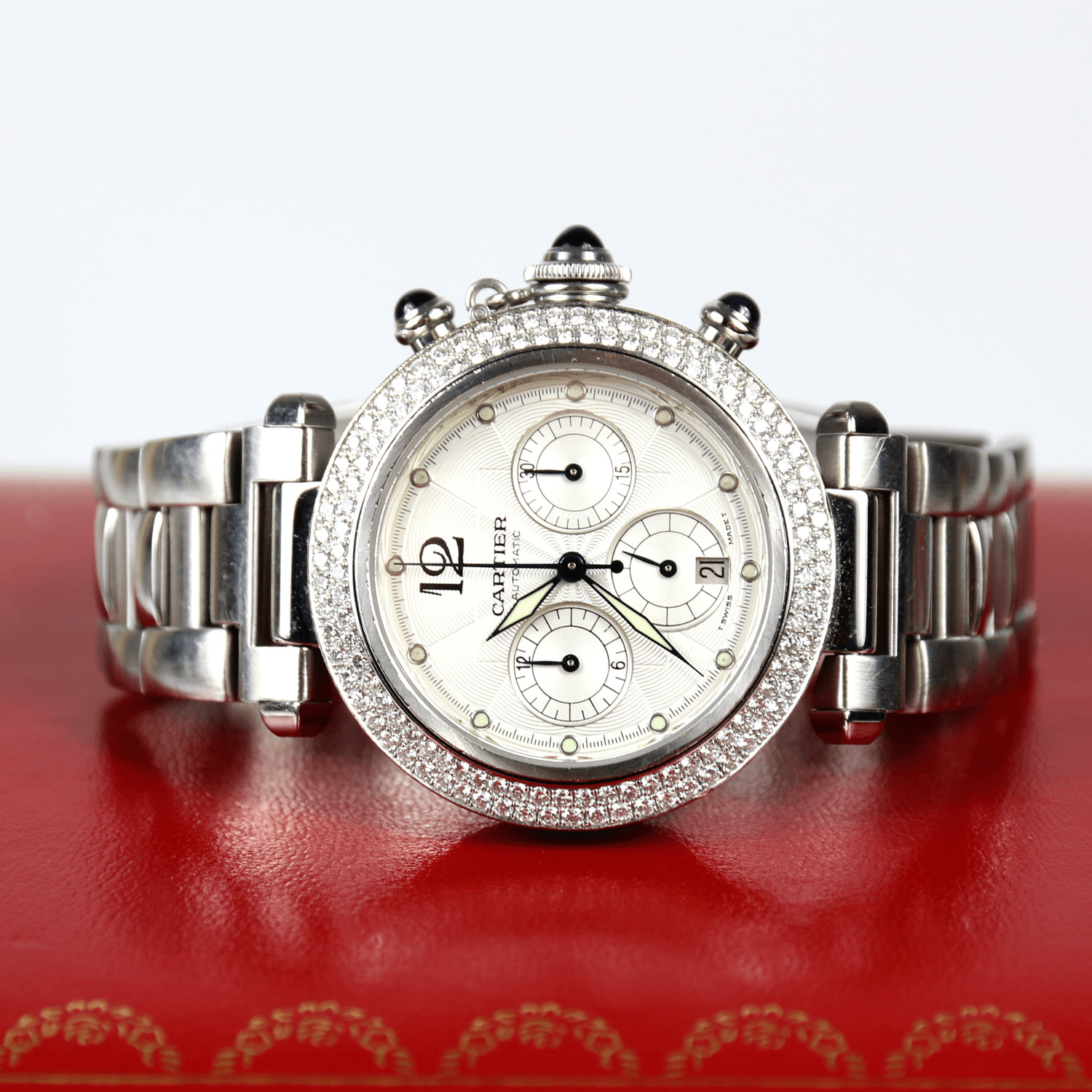 Start » Shop » Uhren » Armbanduhren » CARTIER Pasha, Herrenarmbanduhr/unisex Automatik, Referenz-Nummer 2113, Brillantlünette, Saphirglas, Faltschließe, Sichtboden, Durchmesser 38mm, Ende 1990er Jahre, mit Box, ohne Papiere