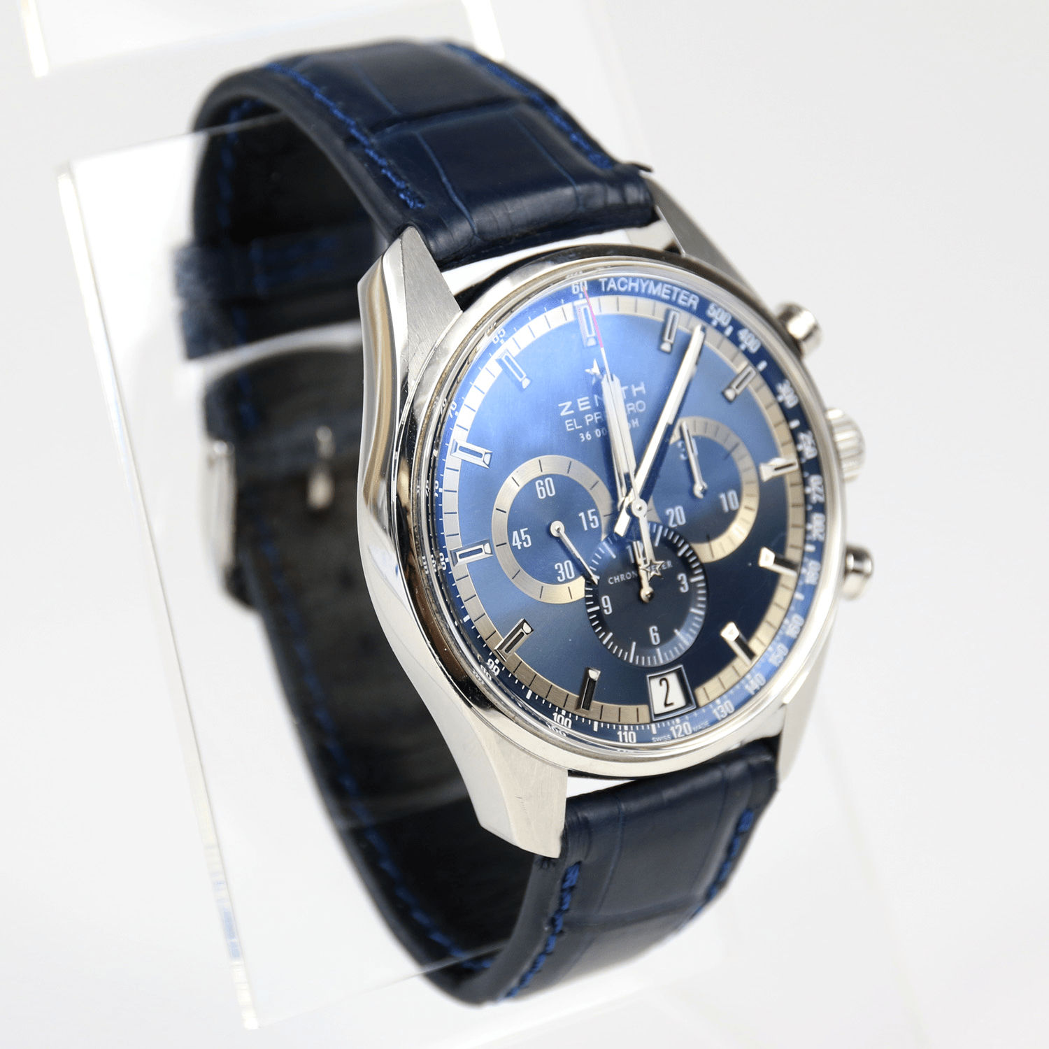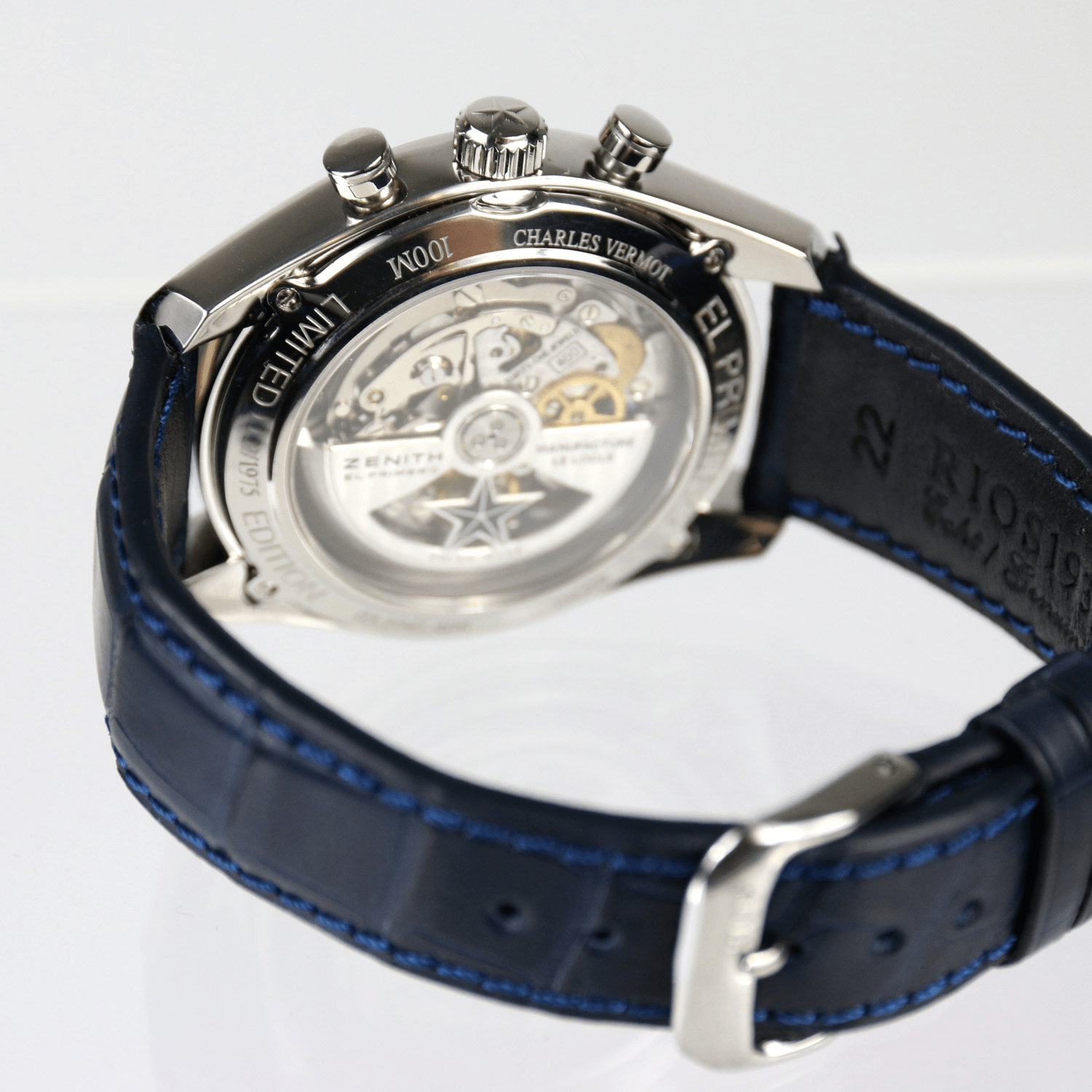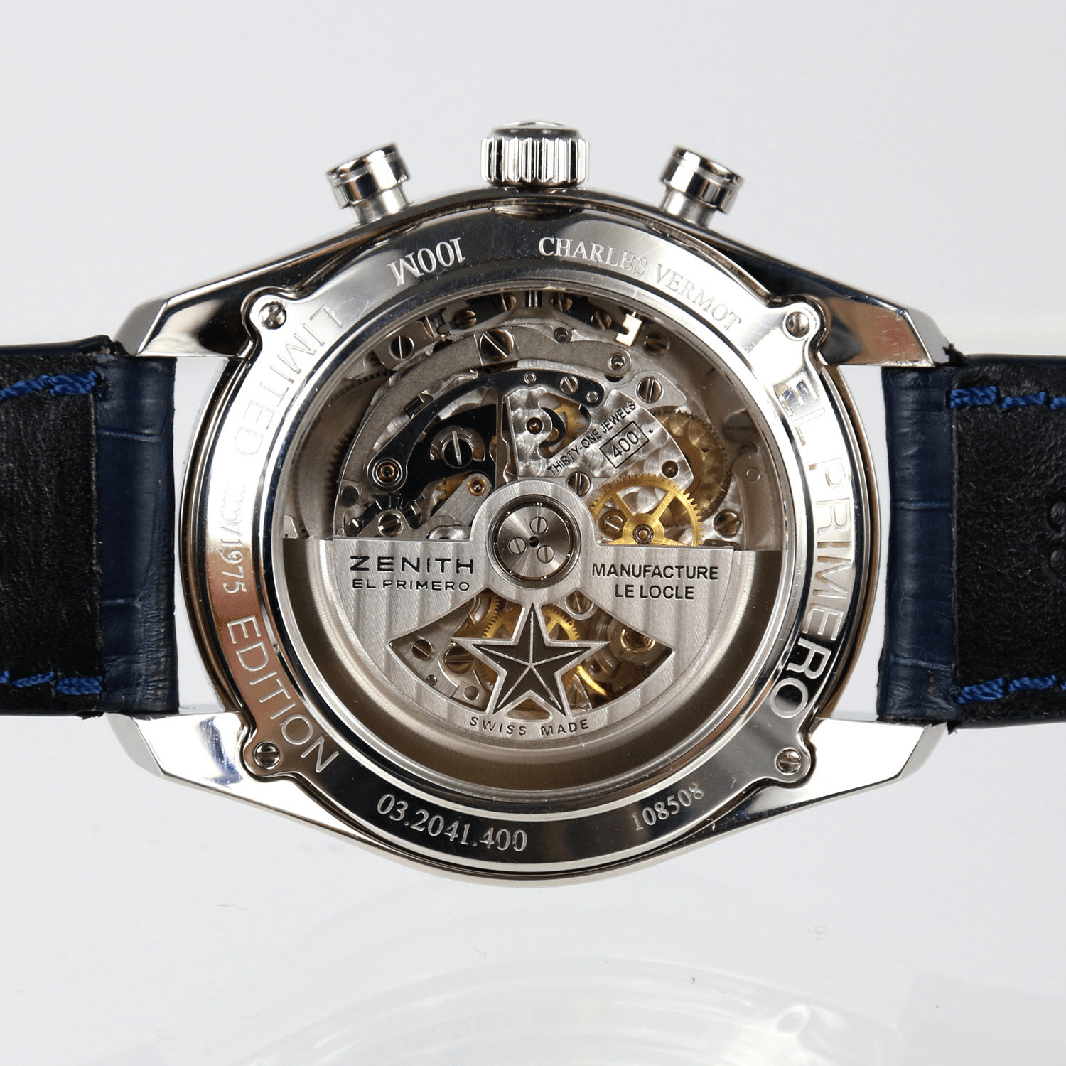 Start » Shop » Uhren » Armbanduhren » ZENITH El Primero 36.000 VpH, Herrenarmbanduhr Chronograph Charles Vermont, Referenz-Nummer 03.2041.400 ohne Box ohne Papiere, ca. 2010, Limitierung /1975, blaues Lederband, Datumsanzeige, Sichtboden, Durchmesser 43mm