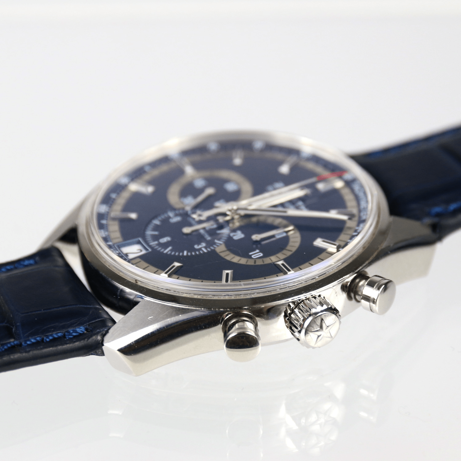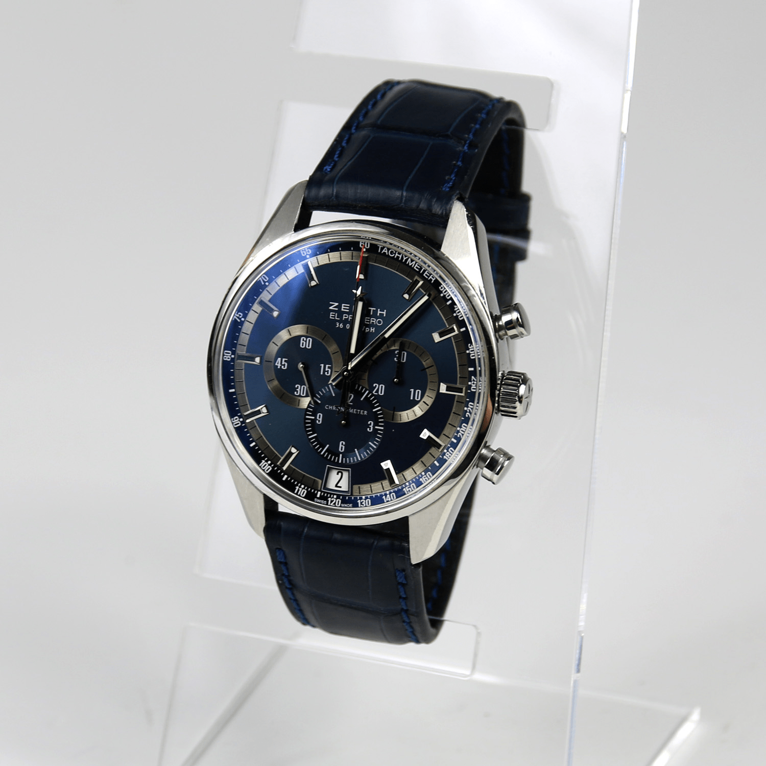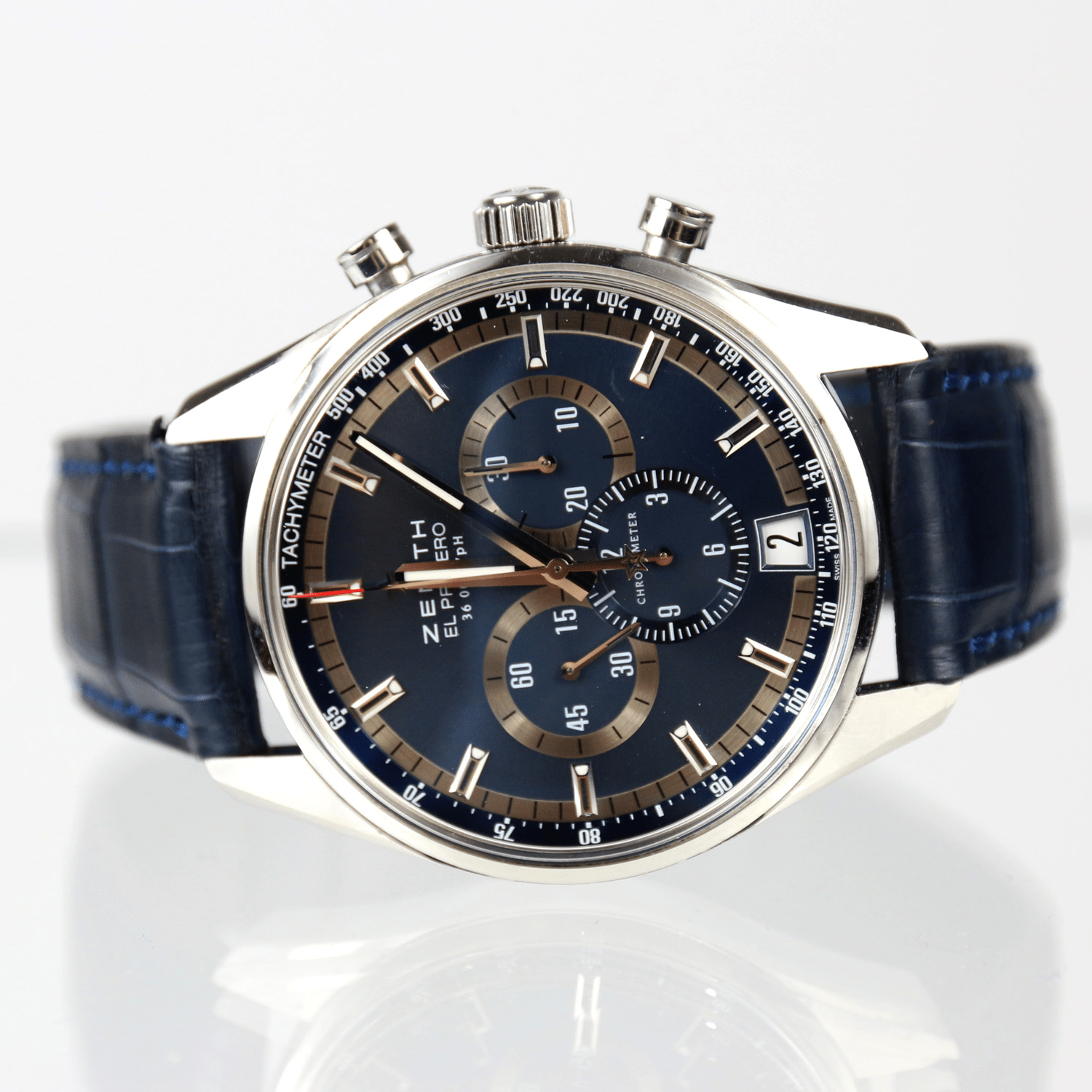 Start » Shop » Uhren » Armbanduhren » ZENITH El Primero 36.000 VpH, Herrenarmbanduhr Chronograph Charles Vermont, Referenz-Nummer 03.2041.400 ohne Box ohne Papiere, ca. 2010, Limitierung /1975, blaues Lederband, Datumsanzeige, Sichtboden, Durchmesser 43mm